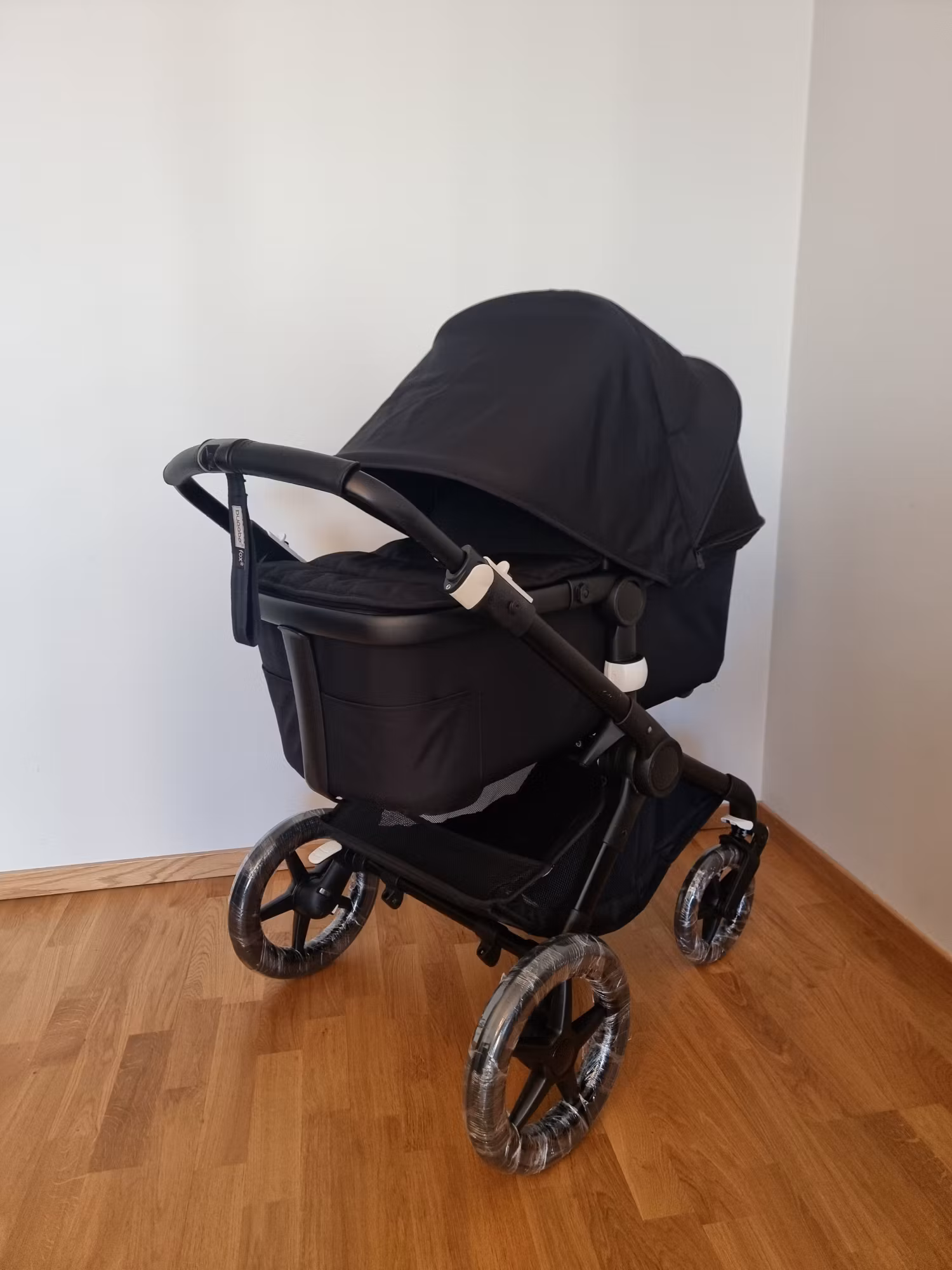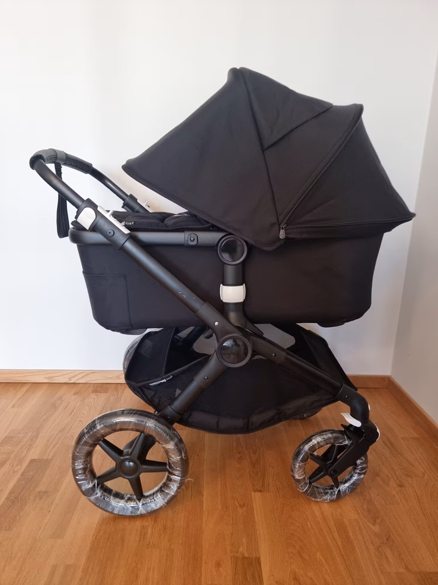 En helt ny Fox 2 All Black, hvor alt er helt nyt undtagen stellet og liggedelen, som er blevet brugt i en kort periode. Andre stoffer er helt nye (inklusive varerkurv og klapvognsdel), samt de punkteringsfrie dække og en helt ny ram, som også er helt ubrugt. Vognen er derfor i meget god stand og kun med et par små mærker på stellet. Vognen er en kombivogn med komplet liggedel og klapvognsdel.